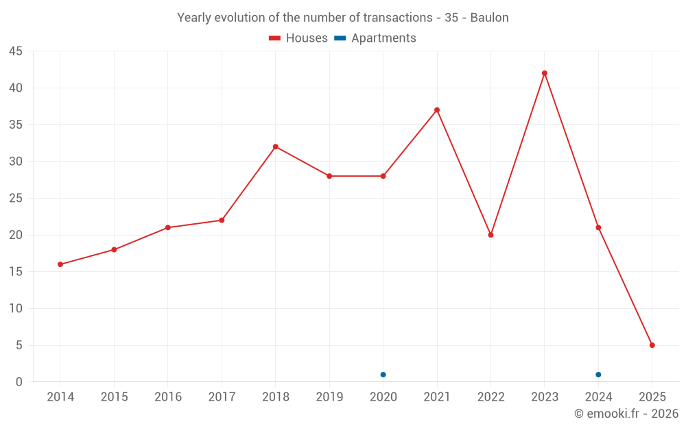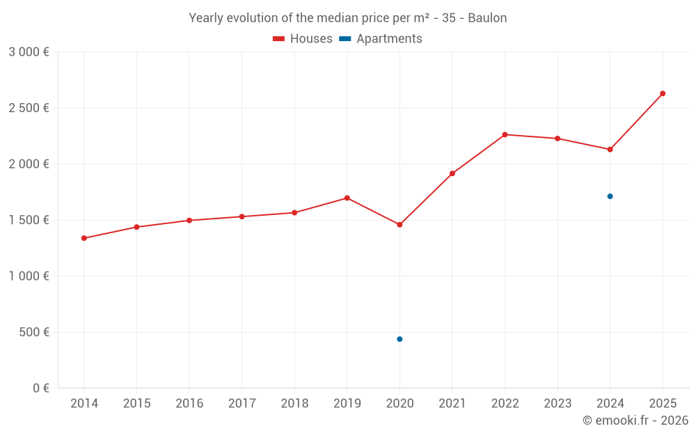 The median price on the 18 house transactions of the last 12 months in the municipality of Baulon was 2 257 € per square meter for a median property value of 192 500 €. Over this period, 60% of transactions were between 1 470 and 2 627 € per square meter (from the 2nd to the 8th deciles).