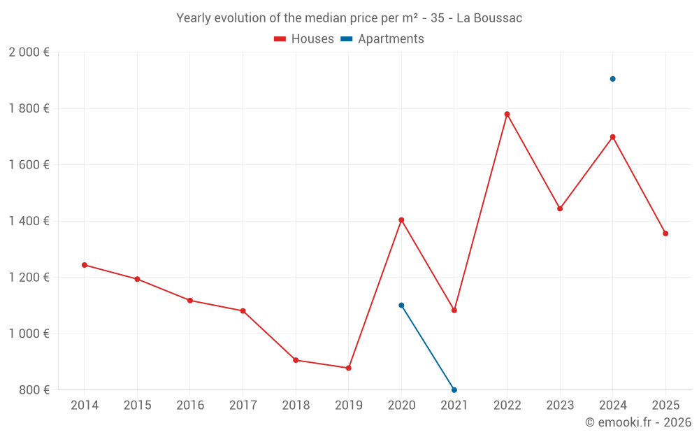 The median price on the 32 house transactions of the last 24 months in the municipality of La Boussac was 1 582 € per square meter for a median property value of 145 000 €. Over this period, 60% of transactions were between 1 275 and 2 316 € per square meter (from the 2nd to the 8th deciles).