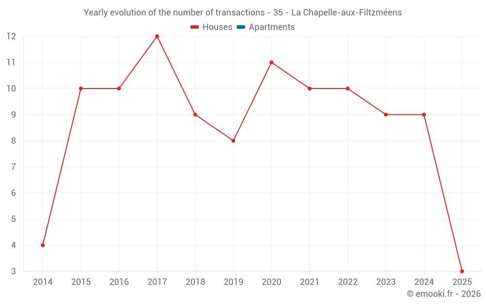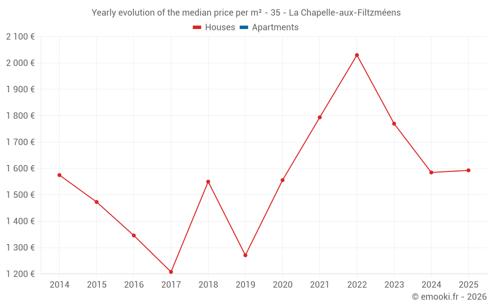 The median price on the 15 house transactions of the last 24 months in the municipality of La Chapelle-aux-Filtzméens was 1 593 € per square meter for a median property value of 175 000 €. Over this period, 60% of transactions were between 1 034 and 2 078 € per square meter (from the 2nd to the 8th deciles).
