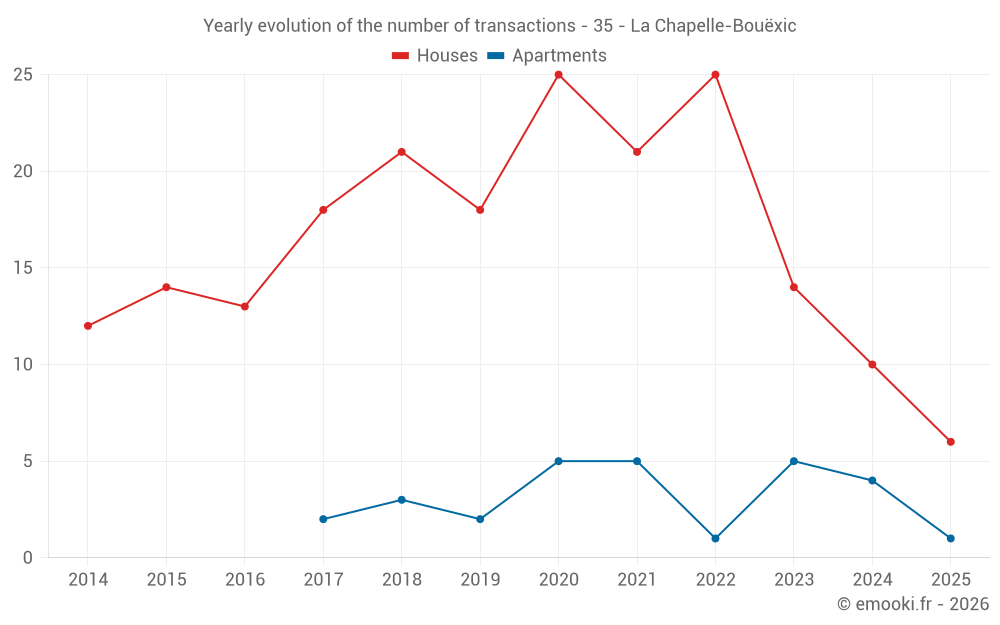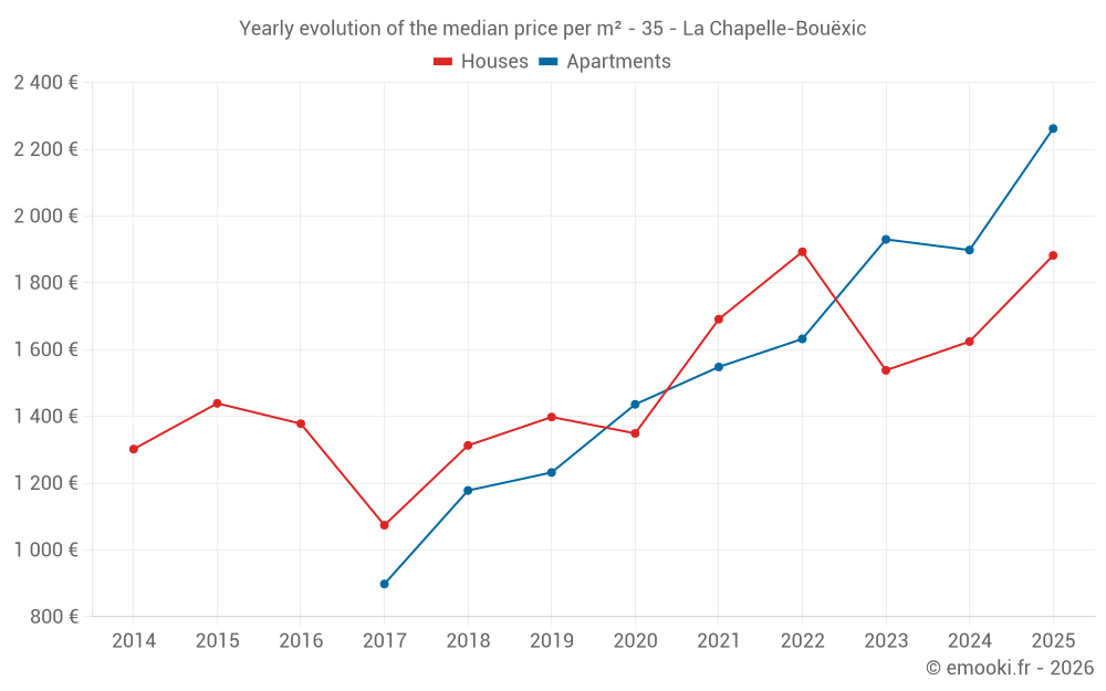 The median price on the 23 house transactions of the last 24 months in the municipality of La Chapelle-Bouëxic was 1 667 € per square meter for a median property value of 185 000 €. Over this period, 60% of transactions were between 1 304 and 2 273 € per square meter (from the 2nd to the 8th deciles).