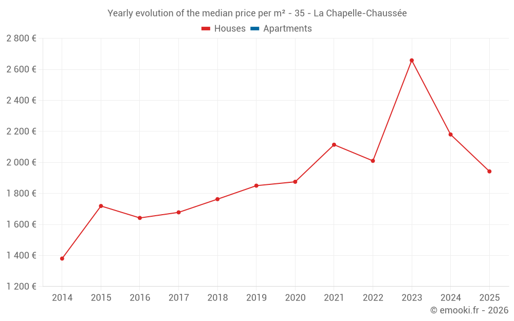 The median price on the 17 house transactions of the last 24 months in the municipality of La Chapelle-Chaussée was 2 109 € per square meter for a median property value of 253 950 €. Over this period, 60% of transactions were between 1 694 and 2 578 € per square meter (from the 2nd to the 8th deciles).