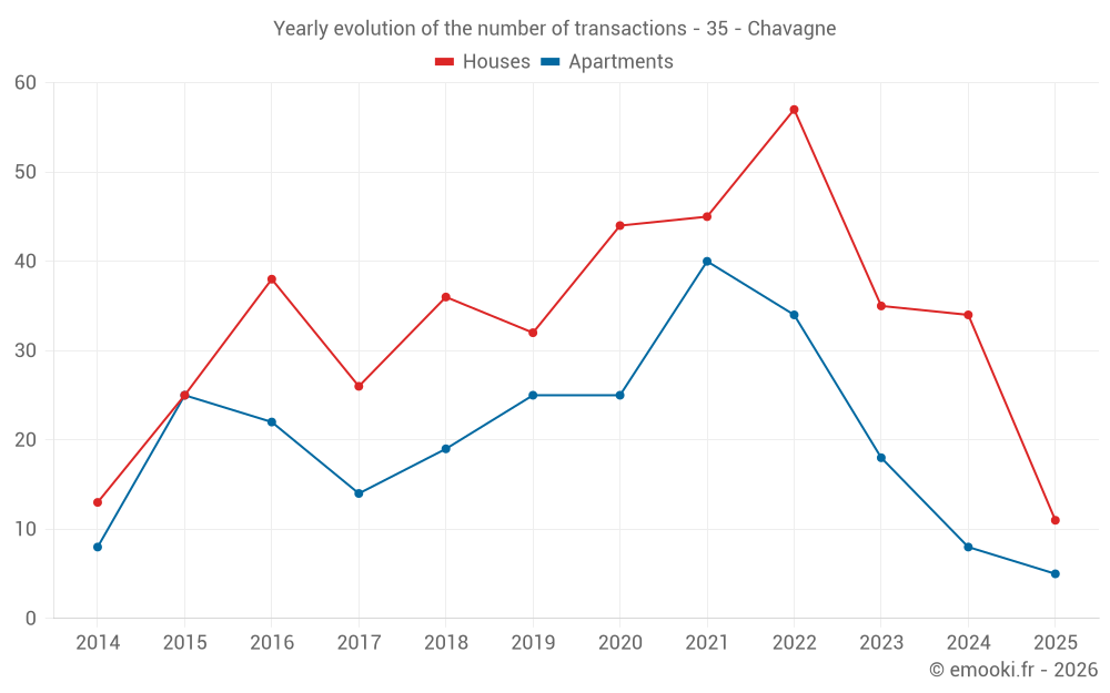 The median price on the 32 house transactions of the last 12 months in the municipality of Chavagne was 2 728 € per square meter for a median property value of 296 076 €. Over this period, 60% of transactions were between 2 150 and 3 056 € per square meter (from the 2nd to the 8th deciles).