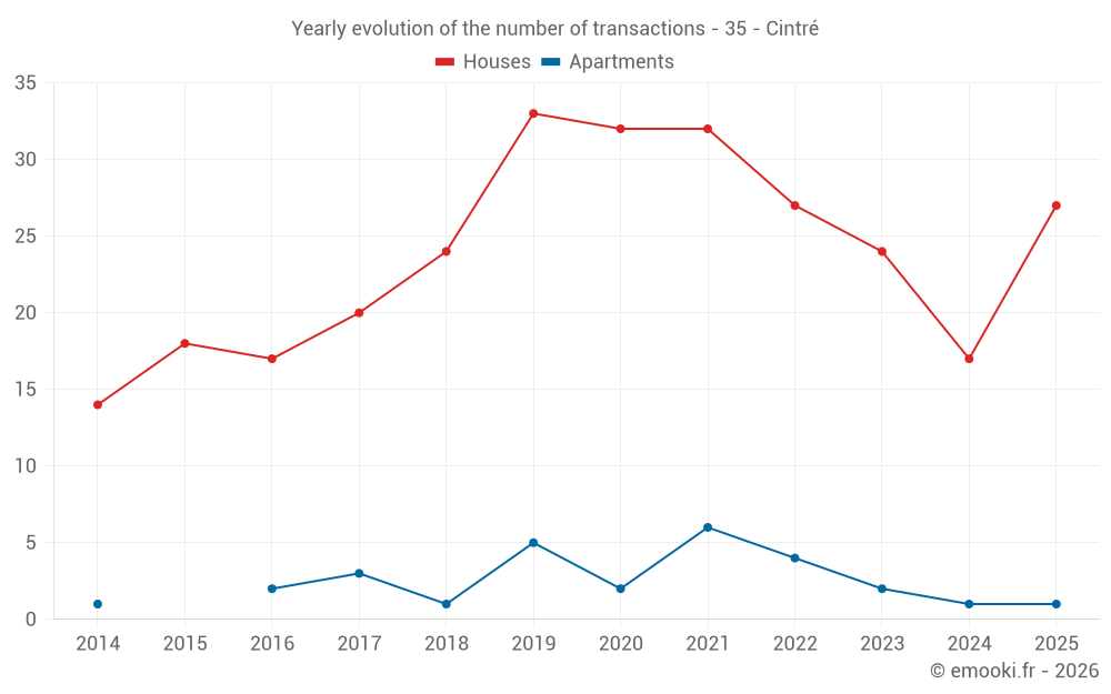 The median price on the 27 house transactions of the last 12 months in the municipality of Cintré was 2 530 € per square meter for a median property value of 284 700 €. Over this period, 60% of transactions were between 2 187 and 2 724 € per square meter (from the 2nd to the 8th deciles).