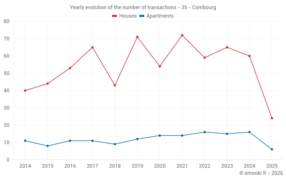 The median price on the 24 house transactions of the last 6 months in the municipality of Combourg was 2 275 € per square meter for a median property value of 232 000 €. Over this period, 60% of transactions were between 1 618 and 2 979 € per square meter (from the 2nd to the 8th deciles).