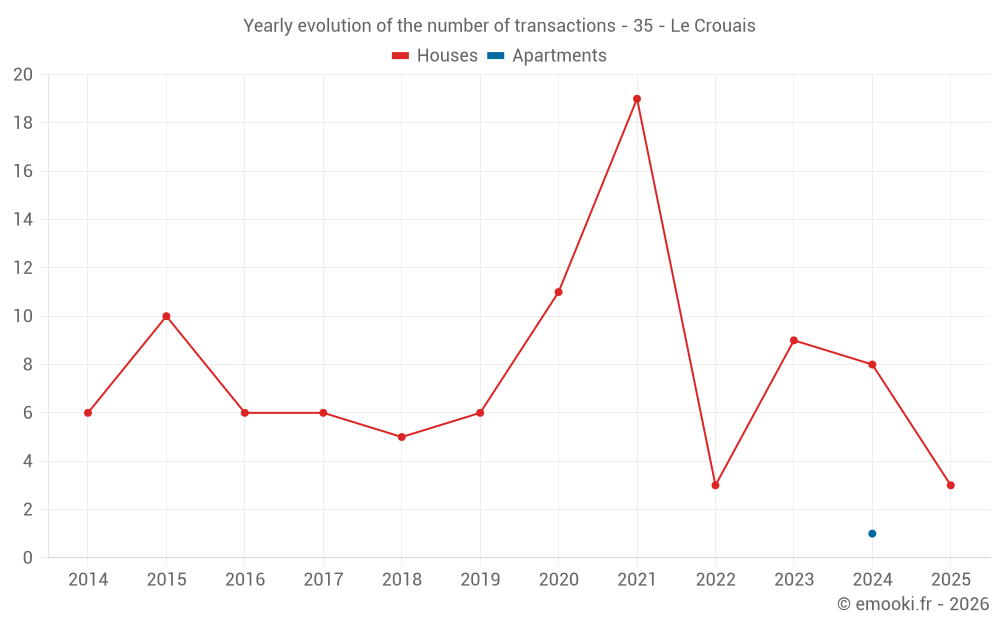 The median price on the 17 house transactions of the last 24 months in the municipality of Le Crouais was 1 832 € per square meter for a median property value of 220 000 €. Over this period, 60% of transactions were between 1 487 and 2 170 € per square meter (from the 2nd to the 8th deciles).