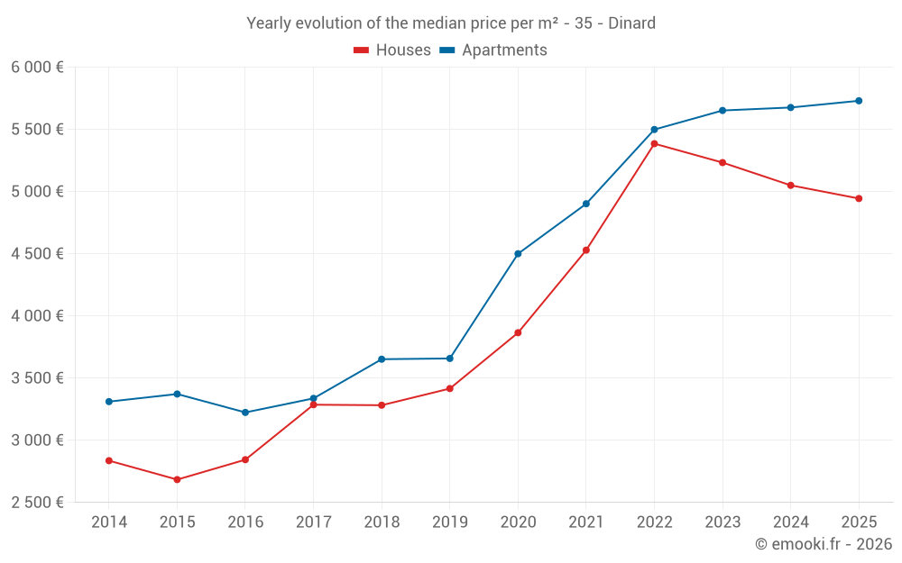 The median price on the 30 apartment transactions of the last 3 months in the municipality of Dinard was 5 306 € per square meter for a median property value of 332 000 €. Over this period, 60% of transactions were between 4 354 and 6 466 € per square meter (from the 2nd to the 8th deciles).