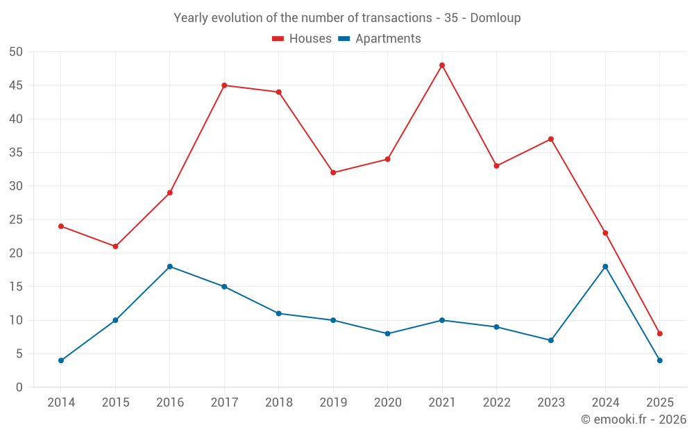 The median price on the 24 house transactions of the last 12 months in the municipality of Domloup was 2 658 € per square meter for a median property value of 296 212 €. Over this period, 60% of transactions were between 2 183 and 3 064 € per square meter (from the 2nd to the 8th deciles).