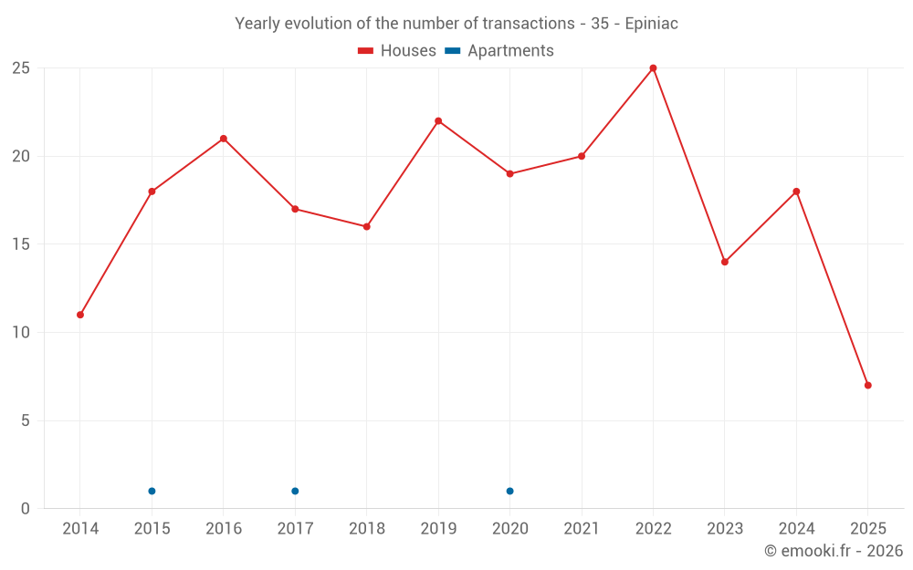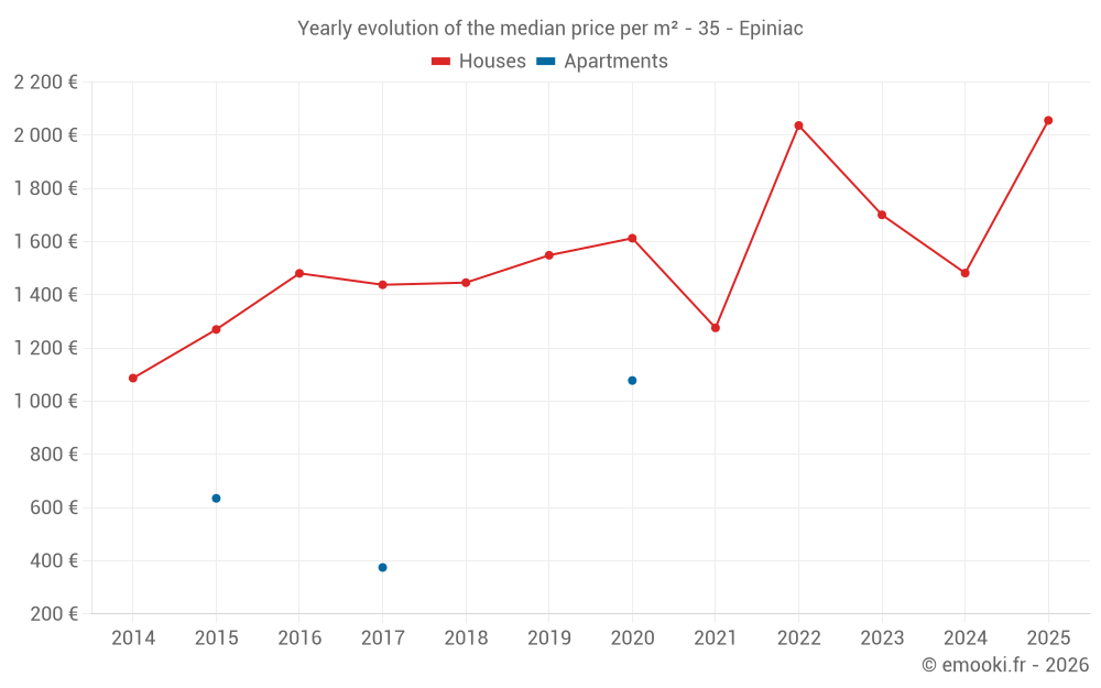 The median price on the 16 house transactions of the last 12 months in the municipality of Epiniac was 2 006 € per square meter for a median property value of 150 000 €. Over this period, 60% of transactions were between 1 220 and 2 596 € per square meter (from the 2nd to the 8th deciles).