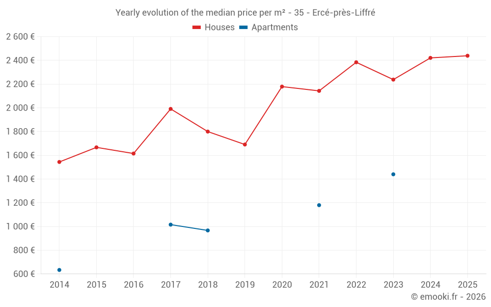 The median price on the 29 house transactions of the last 24 months in the municipality of Ercé-près-Liffré was 2 421 € per square meter for a median property value of 262 830 €. Over this period, 60% of transactions were between 1 905 and 3 037 € per square meter (from the 2nd to the 8th deciles).