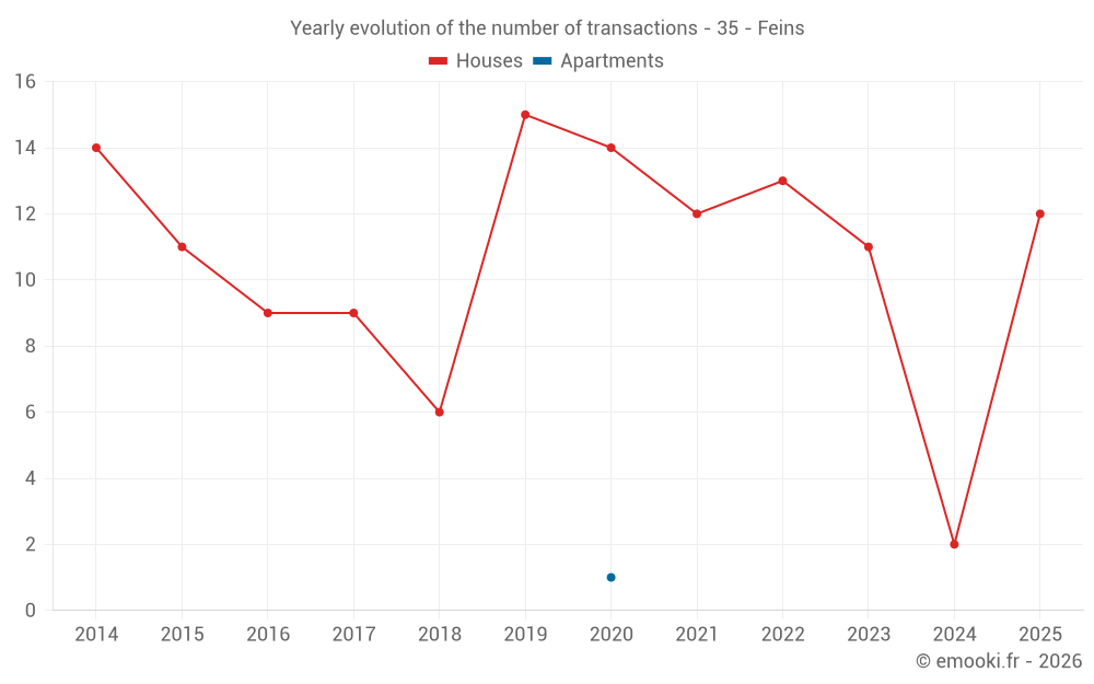 The median price on the 14 house transactions of the last 24 months in the municipality of Feins was 2 114 € per square meter for a median property value of 246 500 €. Over this period, 60% of transactions were between 1 819 and 2 665 € per square meter (from the 2nd to the 8th deciles).