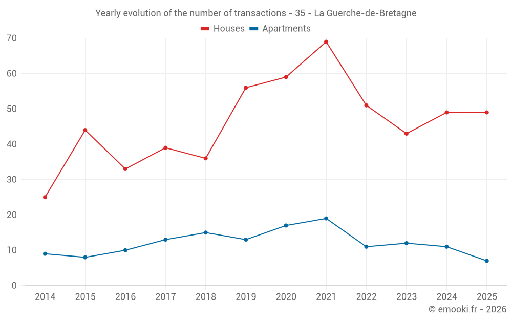 The median price on the 23 house transactions of the last 6 months in the municipality of La Guerche-de-Bretagne was 1 595 € per square meter for a median property value of 137 500 €. Over this period, 60% of transactions were between 1 190 and 2 037 € per square meter (from the 2nd to the 8th deciles).
