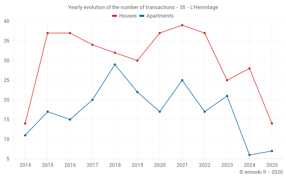 The median price on the 30 house transactions of the last 12 months in the municipality of L'Hermitage was 2 538 € per square meter for a median property value of 280 000 €. Over this period, 60% of transactions were between 2 230 and 2 875 € per square meter (from the 2nd to the 8th deciles).