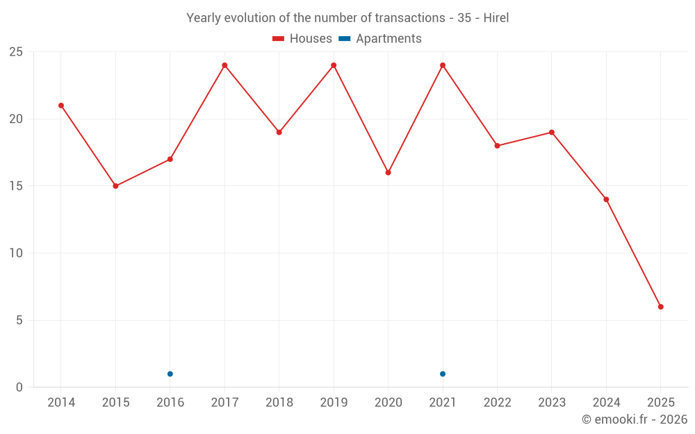 The median price on the 31 house transactions of the last 24 months in the municipality of Hirel was 2 342 € per square meter for a median property value of 219 000 €. Over this period, 60% of transactions were between 1 514 and 2 917 € per square meter (from the 2nd to the 8th deciles).