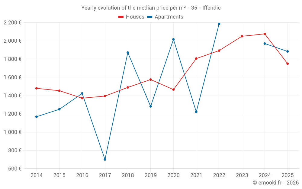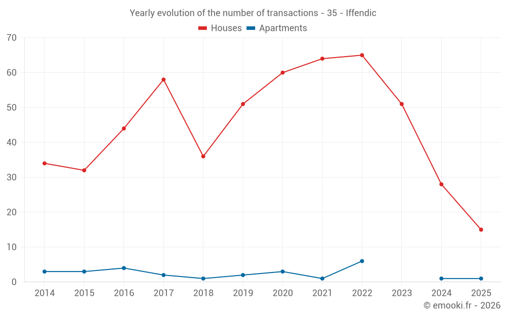 The median price on the 33 house transactions of the last 12 months in the municipality of Iffendic was 2 000 € per square meter for a median property value of 185 000 €. Over this period, 60% of transactions were between 1 391 and 2 544 € per square meter (from the 2nd to the 8th deciles).