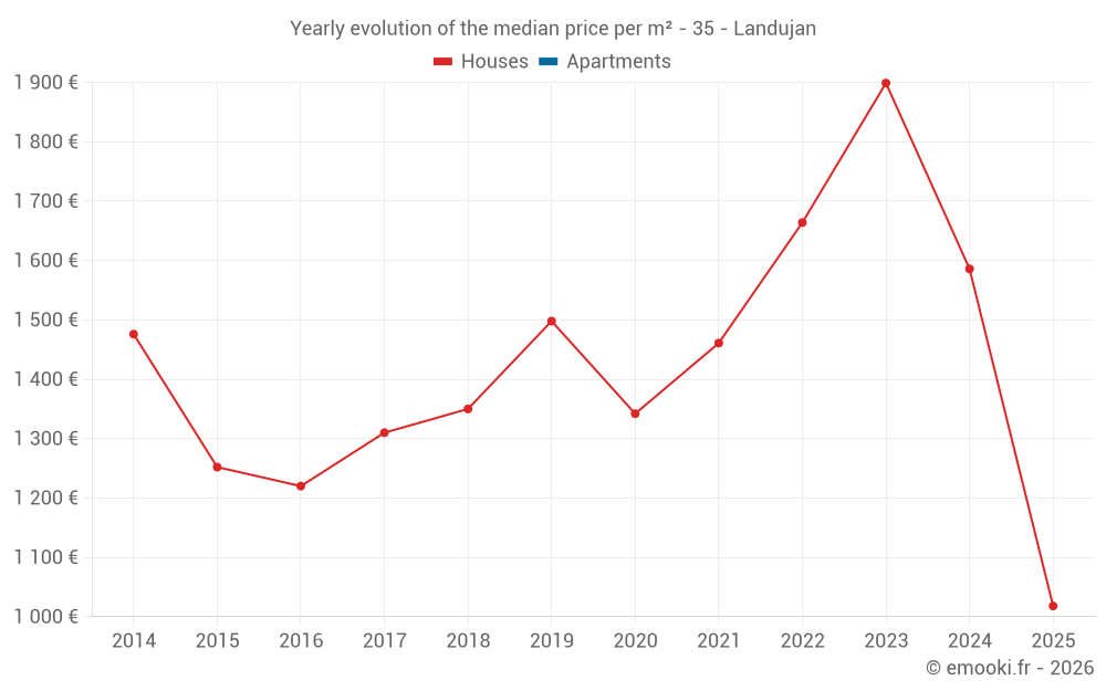 The median price on the 19 house transactions of the last 24 months in the municipality of Landujan was 1 763 € per square meter for a median property value of 160 000 €. Over this period, 60% of transactions were between 1 214 and 2 428 € per square meter (from the 2nd to the 8th deciles).