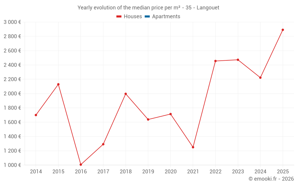 The median price on the 16 house transactions of the last 24 months in the municipality of Langouet was 2 360 € per square meter for a median property value of 210 000 €. Over this period, 60% of transactions were between 1 910 and 2 901 € per square meter (from the 2nd to the 8th deciles).