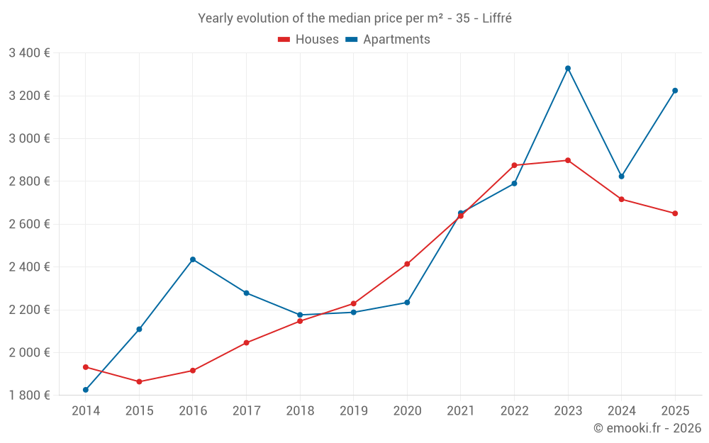 The median price on the 35 house transactions of the last 6 months in the municipality of Liffré was 2 650 € per square meter for a median property value of 308 370 €. Over this period, 60% of transactions were between 2 418 and 3 250 € per square meter (from the 2nd to the 8th deciles).