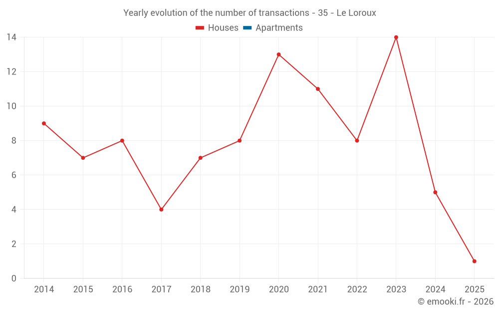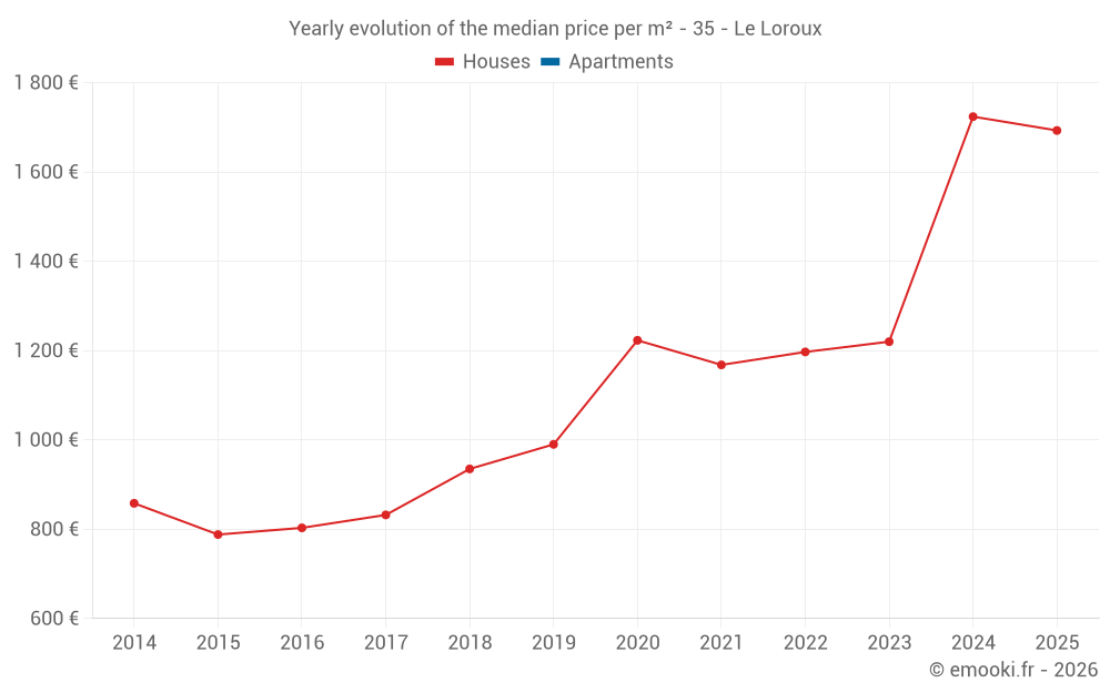 The median price on the 16 house transactions of the last 24 months in the municipality of Le Loroux was 1 346 € per square meter for a median property value of 150 000 €. Over this period, 60% of transactions were between 899 and 1 724 € per square meter (from the 2nd to the 8th deciles).
