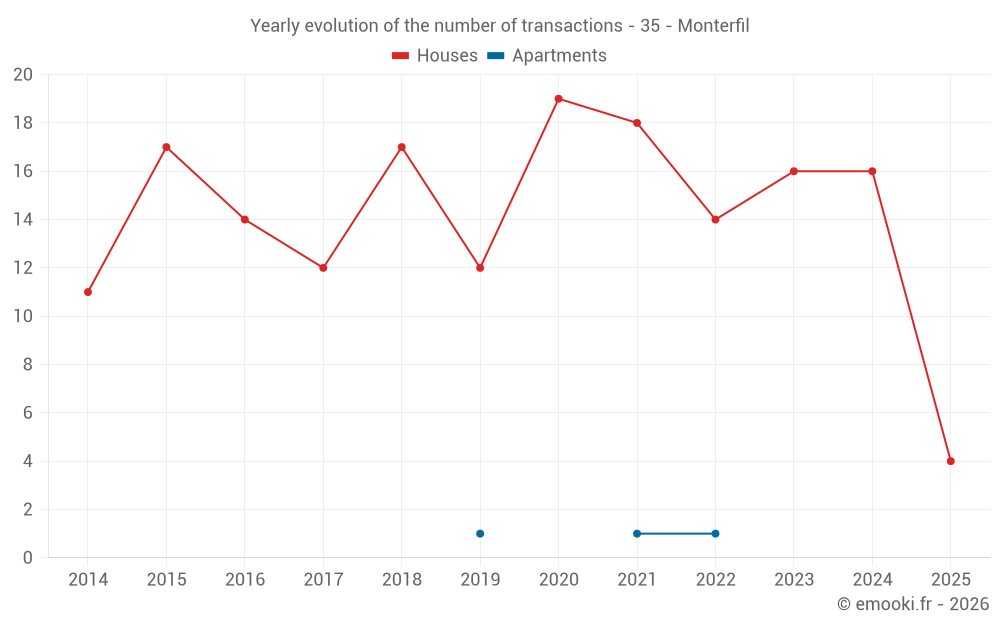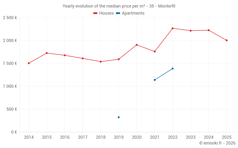 The median price on the 29 house transactions of the last 24 months in the municipality of Monterfil was 2 292 € per square meter for a median property value of 229 000 €. Over this period, 60% of transactions were between 1 616 and 2 822 € per square meter (from the 2nd to the 8th deciles).