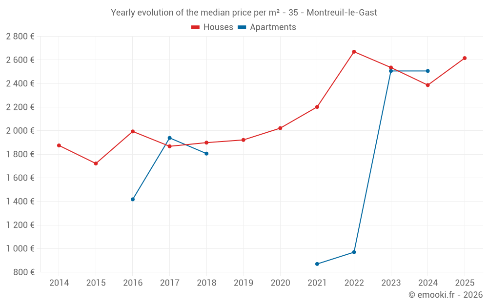 The median price on the 27 house transactions of the last 12 months in the municipality of Montreuil-le-Gast was 2 482 € per square meter for a median property value of 225 000 €. Over this period, 60% of transactions were between 1 983 and 2 728 € per square meter (from the 2nd to the 8th deciles).