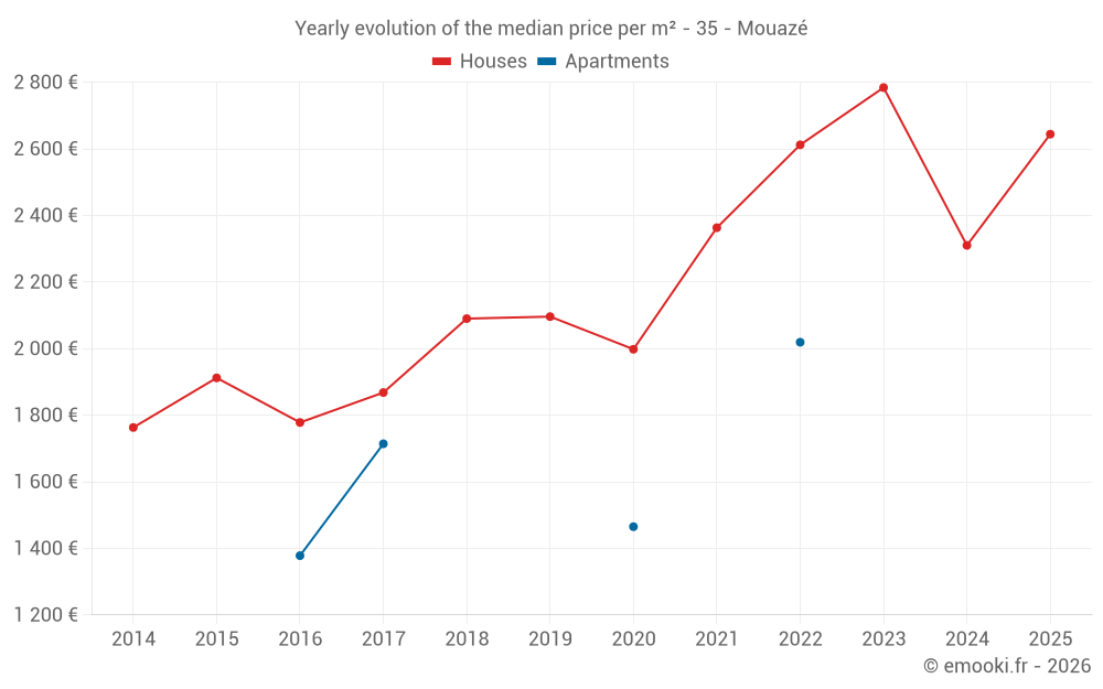 The median price on the 27 house transactions of the last 24 months in the municipality of Mouazé was 2 579 € per square meter for a median property value of 250 000 €. Over this period, 60% of transactions were between 2 139 and 2 919 € per square meter (from the 2nd to the 8th deciles).