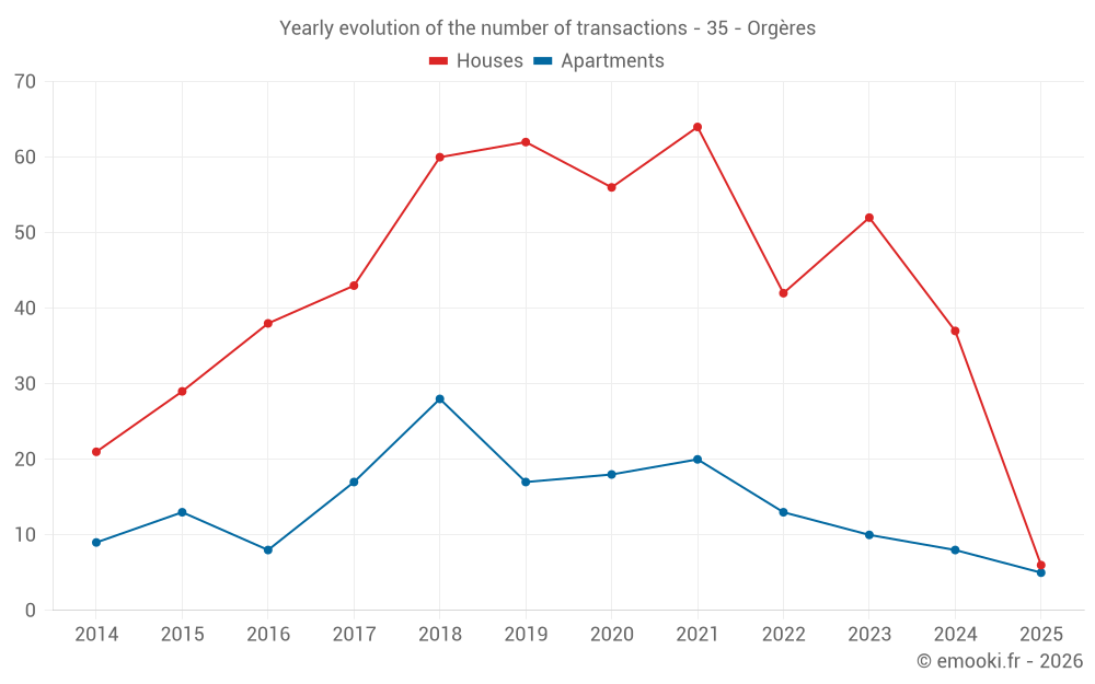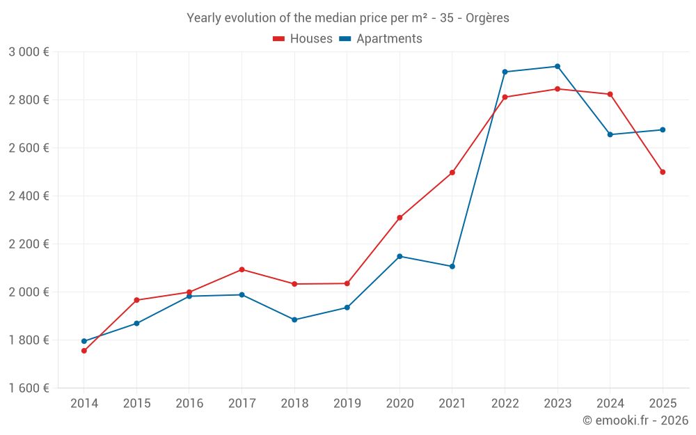 The median price on the 31 house transactions of the last 12 months in the municipality of Orgères was 2 727 € per square meter for a median property value of 286 320 €. Over this period, 60% of transactions were between 2 291 and 2 989 € per square meter (from the 2nd to the 8th deciles).