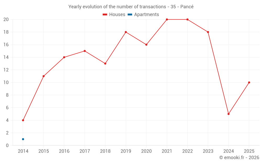 The median price on the 24 house transactions of the last 24 months in the municipality of Pancé was 1 976 € per square meter for a median property value of 198 465 €. Over this period, 60% of transactions were between 1 480 and 2 193 € per square meter (from the 2nd to the 8th deciles).