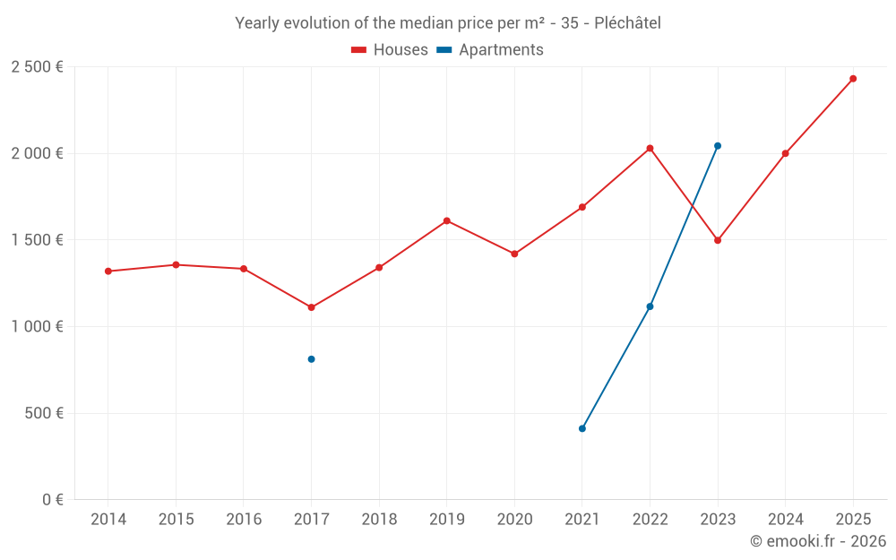 The median price on the 28 house transactions of the last 12 months in the municipality of Pléchâtel was 2 047 € per square meter for a median property value of 215 000 €. Over this period, 60% of transactions were between 1 603 and 2 511 € per square meter (from the 2nd to the 8th deciles).