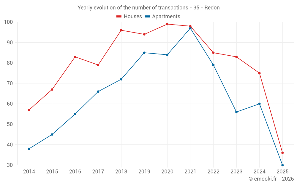 The median price on the 30 apartment transactions of the last 6 months in the municipality of Redon was 2 052 € per square meter for a median property value of 95 500 €. Over this period, 60% of transactions were between 1 406 and 2 712 € per square meter (from the 2nd to the 8th deciles).