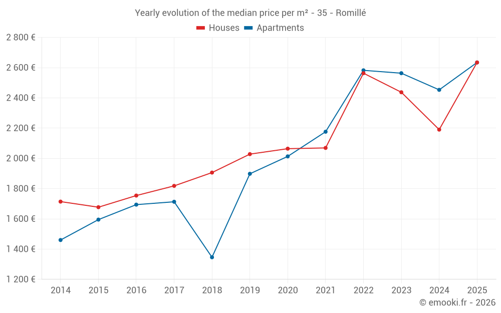 The median price on the 30 house transactions of the last 12 months in the municipality of Romillé was 2 546 € per square meter for a median property value of 255 000 €. Over this period, 60% of transactions were between 2 050 and 2 810 € per square meter (from the 2nd to the 8th deciles).