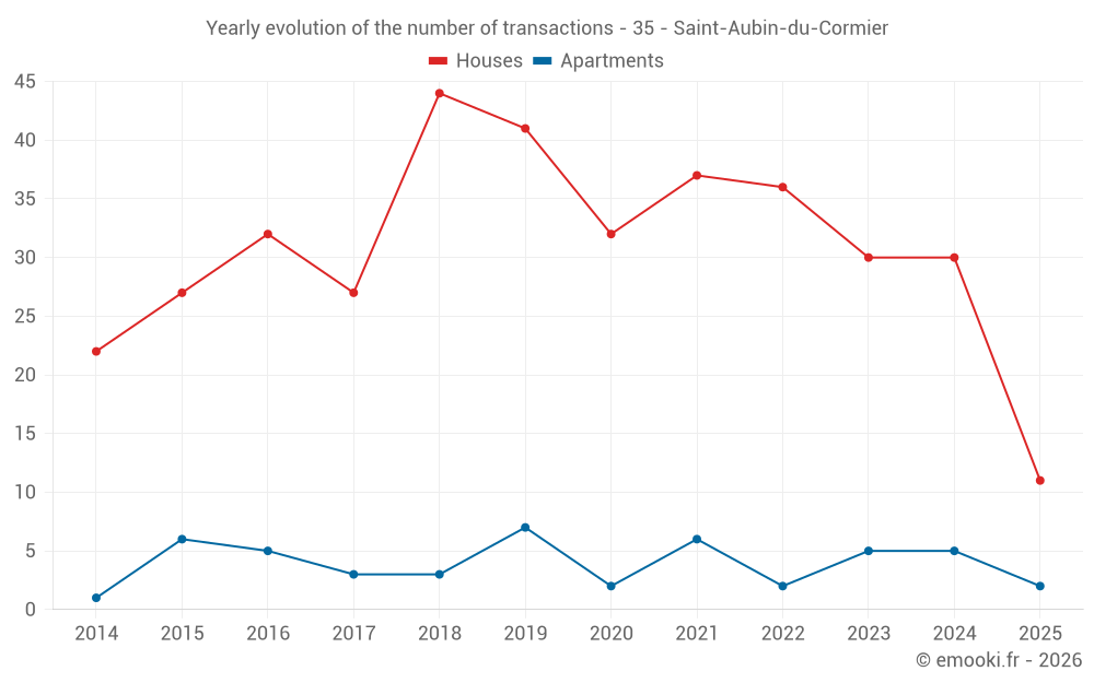 The median price on the 24 house transactions of the last 12 months in the municipality of Saint-Aubin-du-Cormier was 2 292 € per square meter for a median property value of 261 500 €. Over this period, 60% of transactions were between 1 636 and 2 650 € per square meter (from the 2nd to the 8th deciles).