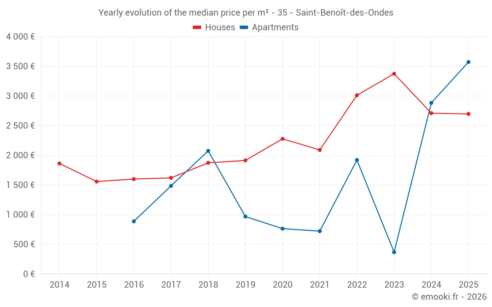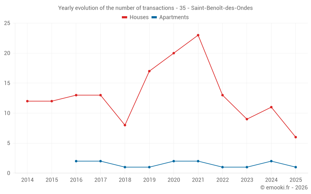 The median price on the 24 house transactions of the last 24 months in the municipality of Saint-Benoît-des-Ondes was 2 788 € per square meter for a median property value of 279 000 €. Over this period, 60% of transactions were between 2 453 and 3 540 € per square meter (from the 2nd to the 8th deciles).