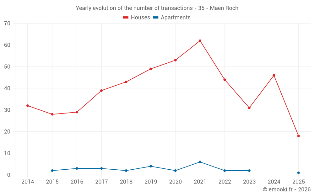 The median price on the 18 house transactions of the last 6 months in the municipality of Maen Roch was 1 638 € per square meter for a median property value of 151 000 €. Over this period, 60% of transactions were between 1 218 and 2 085 € per square meter (from the 2nd to the 8th deciles).