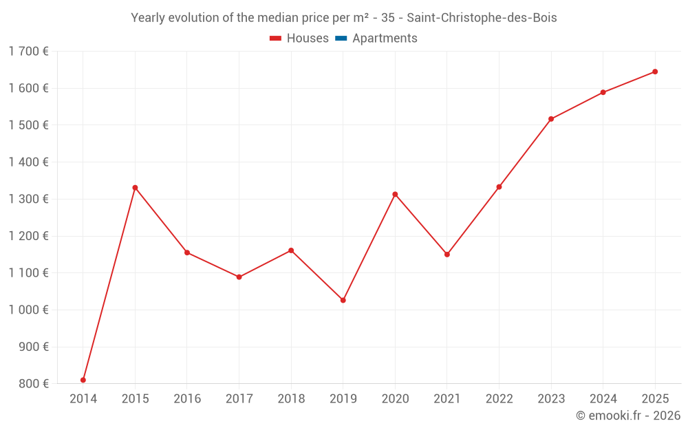 The median price on the 17 house transactions of the last 24 months in the municipality of Saint-Christophe-des-Bois was 1 645 € per square meter for a median property value of 138 000 €. Over this period, 60% of transactions were between 1 525 and 1 917 € per square meter (from the 2nd to the 8th deciles).