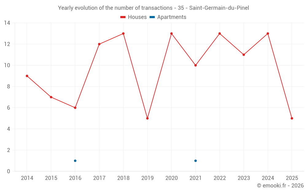 The median price on the 18 house transactions of the last 24 months in the municipality of Saint-Germain-du-Pinel was 1 554 € per square meter for a median property value of 141 000 €. Over this period, 60% of transactions were between 1 074 and 2 094 € per square meter (from the 2nd to the 8th deciles).