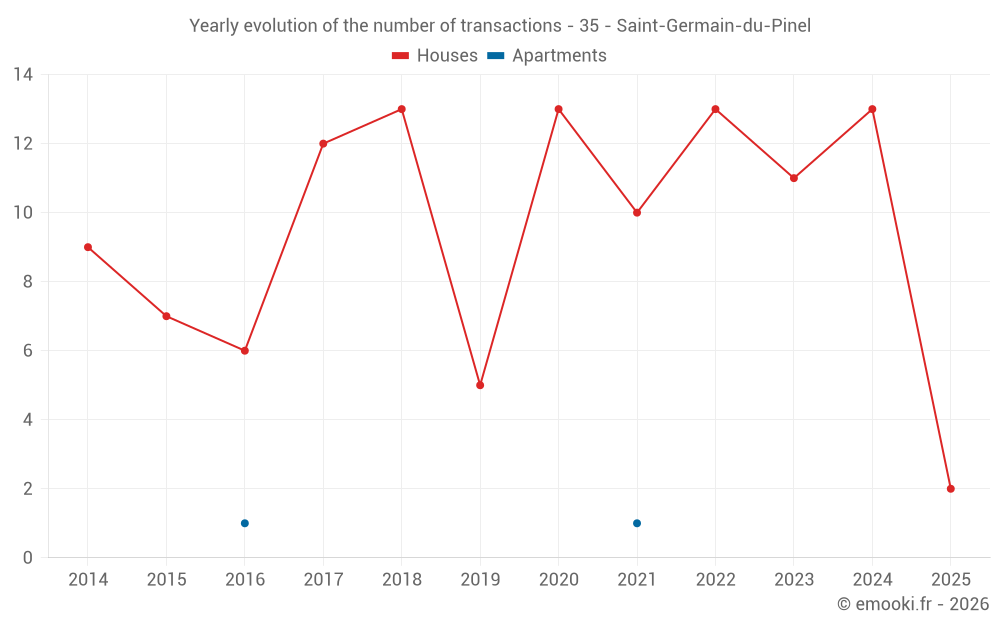 The median price on the 19 house transactions of the last 24 months in the municipality of Saint-Germain-du-Pinel was 1 477 € per square meter for a median property value of 150 000 €. Over this period, 60% of transactions were between 1 099 and 2 120 € per square meter (from the 2nd to the 8th deciles).