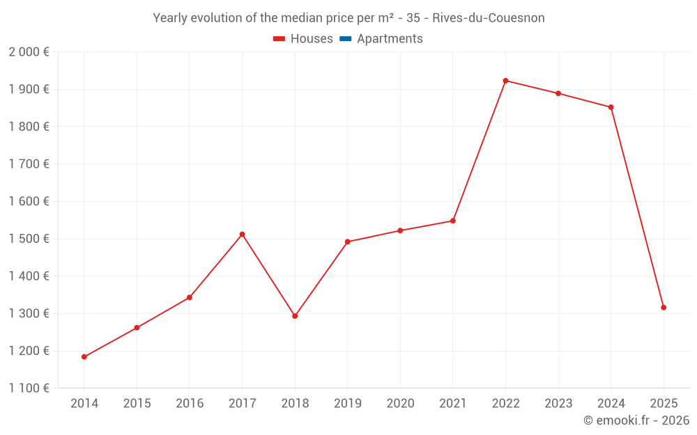The median price on the 25 house transactions of the last 12 months in the municipality of Rives-du-Couesnon was 1 852 € per square meter for a median property value of 161 000 €. Over this period, 60% of transactions were between 1 199 and 2 443 € per square meter (from the 2nd to the 8th deciles).