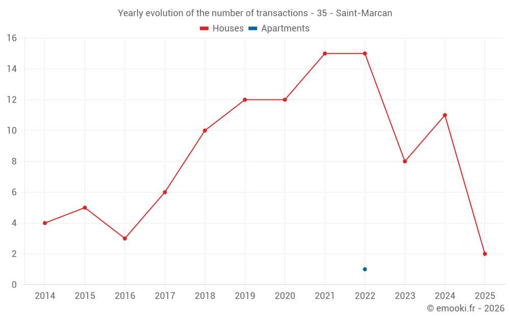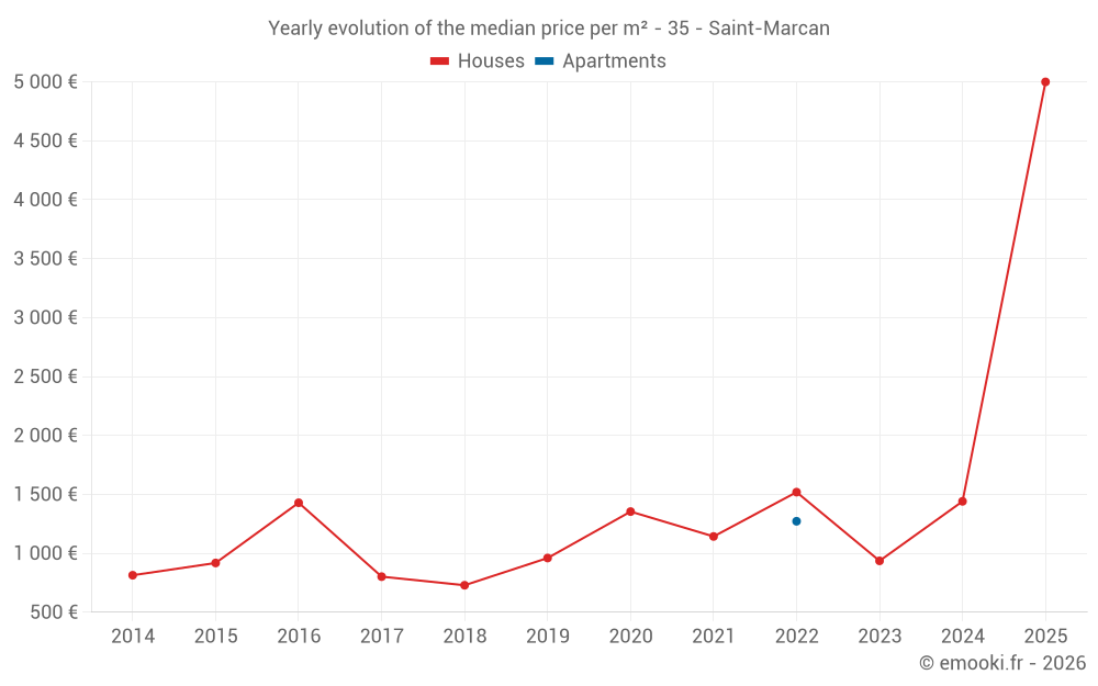 The median price on the 16 house transactions of the last 24 months in the municipality of Saint-Marcan was 1 831 € per square meter for a median property value of 160 500 €. Over this period, 60% of transactions were between 840 and 2 120 € per square meter (from the 2nd to the 8th deciles).