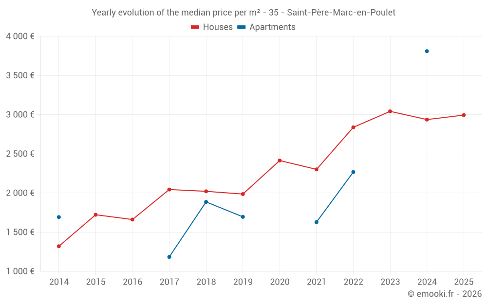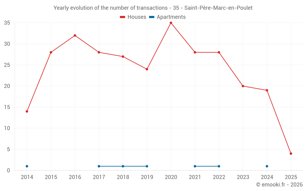 The median price on the 34 house transactions of the last 24 months in the municipality of Saint-Père-Marc-en-Poulet was 2 966 € per square meter for a median property value of 313 500 €. Over this period, 60% of transactions were between 2 473 and 3 882 € per square meter (from the 2nd to the 8th deciles).