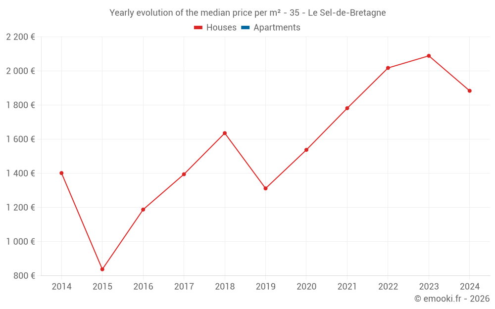 The median price on the 19 house transactions of the last 24 months in the municipality of Le Sel-de-Bretagne was 2 000 € per square meter for a median property value of 209 000 €. Over this period, 60% of transactions were between 1 791 and 2 420 € per square meter (from the 2nd to the 8th deciles).