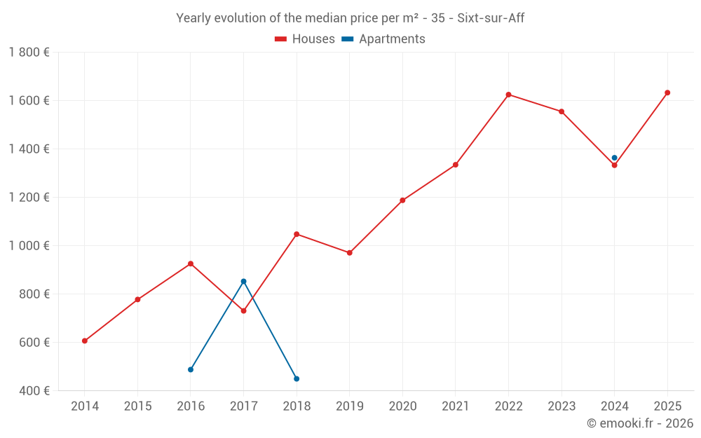 The median price on the 17 house transactions of the last 12 months in the municipality of Sixt-sur-Aff was 1 463 € per square meter for a median property value of 153 050 €. Over this period, 60% of transactions were between 1 056 and 2 065 € per square meter (from the 2nd to the 8th deciles).