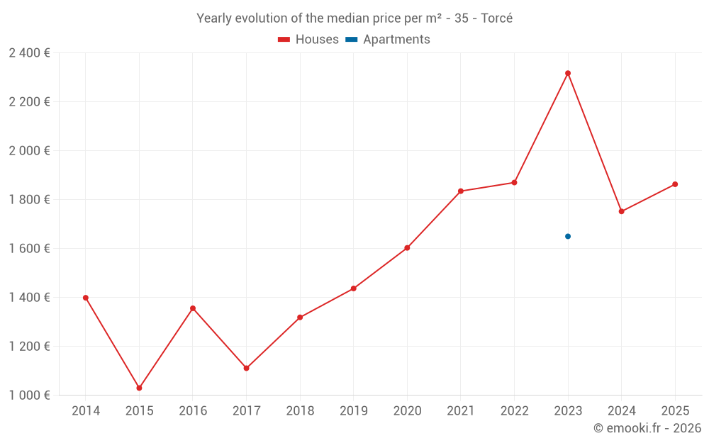 The median price on the 17 house transactions of the last 24 months in the municipality of Torcé was 1 765 € per square meter for a median property value of 190 000 €. Over this period, 60% of transactions were between 1 669 and 2 319 € per square meter (from the 2nd to the 8th deciles).