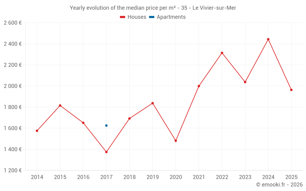 The median price on the 20 house transactions of the last 24 months in the municipality of Le Vivier-sur-Mer was 2 030 € per square meter for a median property value of 190 000 €. Over this period, 60% of transactions were between 1 895 and 2 423 € per square meter (from the 2nd to the 8th deciles).