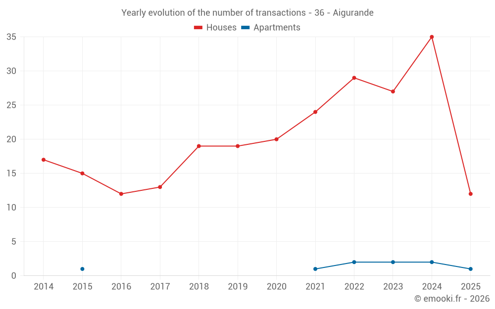The median price on the 29 house transactions of the last 12 months in the municipality of Aigurande was 803 € per square meter for a median property value of 72 500 €. Over this period, 60% of transactions were between 524 and 1 040 € per square meter (from the 2nd to the 8th deciles).