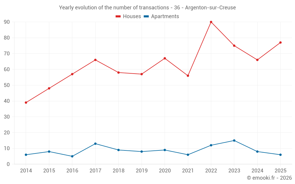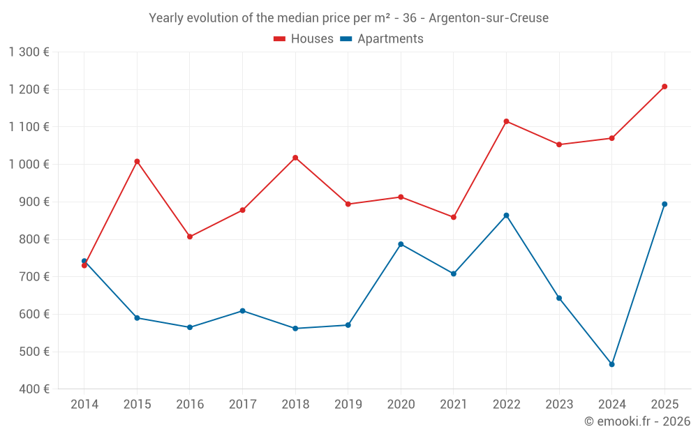 The median price on the 14 apartment transactions of the last 24 months in the municipality of Argenton-sur-Creuse was 628 € per square meter for a median property value of 80 000 €. Over this period, 60% of transactions were between 313 and 1 026 € per square meter (from the 2nd to the 8th deciles).