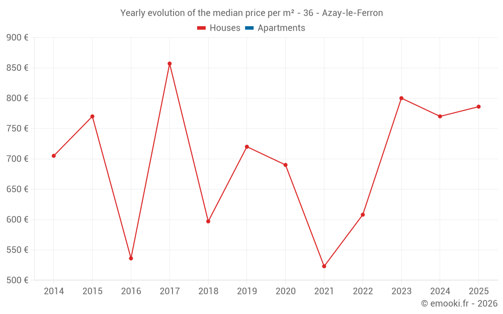 The median price on the 18 house transactions of the last 12 months in the municipality of Azay-le-Ferron was 786 € per square meter for a median property value of 80 000 €. Over this period, 60% of transactions were between 577 and 1 051 € per square meter (from the 2nd to the 8th deciles).
