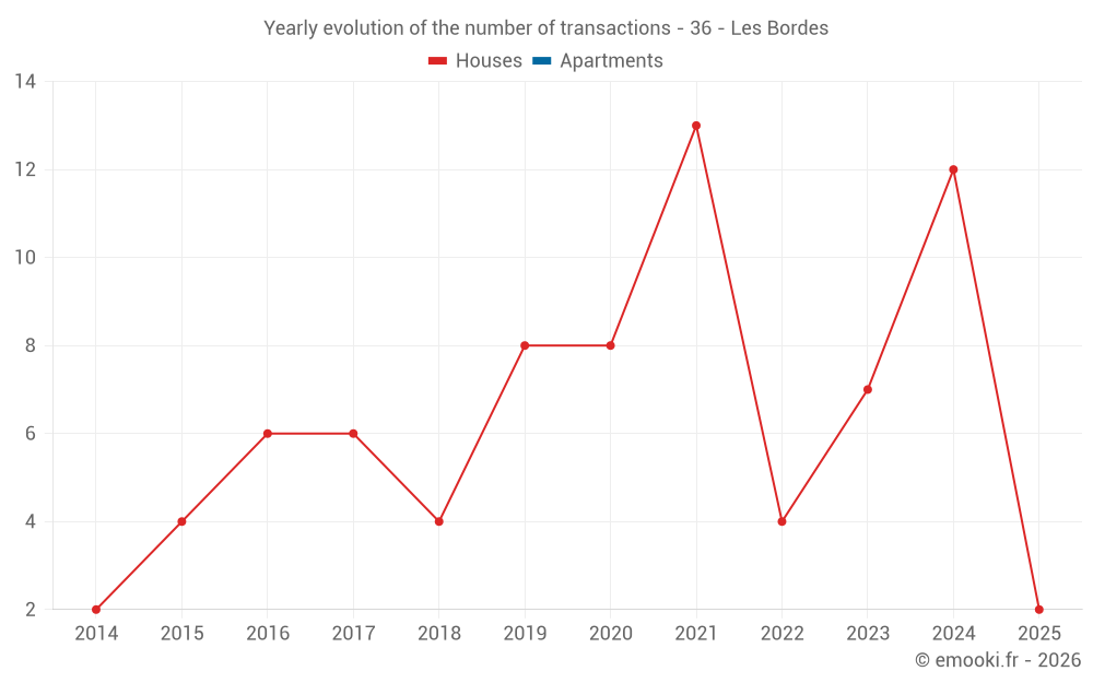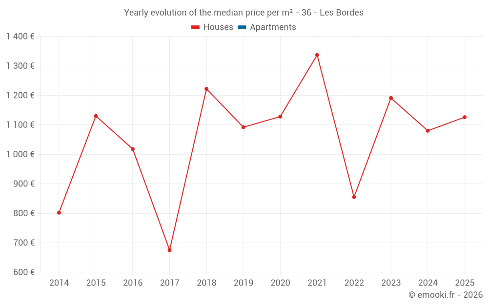 The median price on the 17 house transactions of the last 24 months in the municipality of Les Bordes was 1 024 € per square meter for a median property value of 82 500 €. Over this period, 60% of transactions were between 701 and 1 342 € per square meter (from the 2nd to the 8th deciles).
