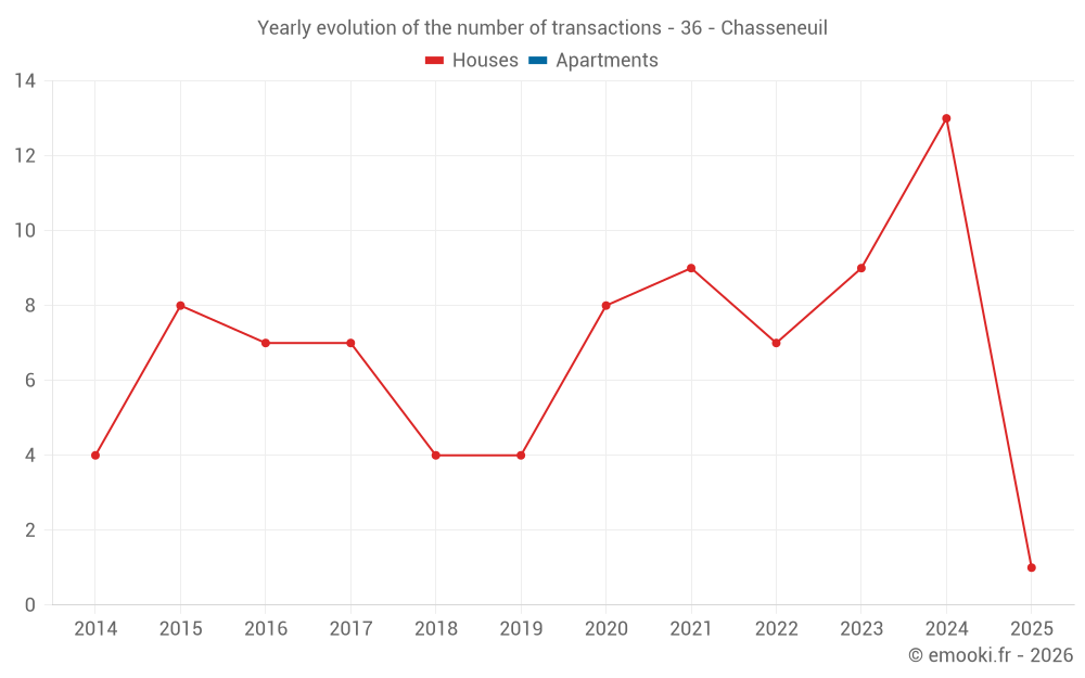 The median price on the 18 house transactions of the last 24 months in the municipality of Chasseneuil was 871 € per square meter for a median property value of 75 500 €. Over this period, 60% of transactions were between 480 and 1 455 € per square meter (from the 2nd to the 8th deciles).