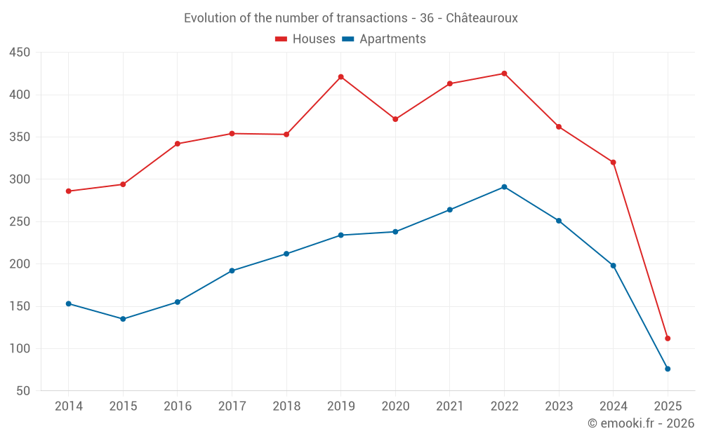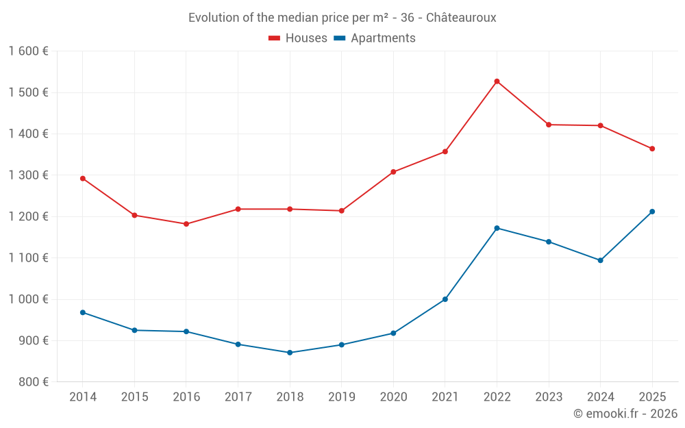 The median price on the 36 house transactions of the last 3 months in the municipality of Châteauroux was 1 272 € per square meter for a median property value of 104 000 €. Over this period, 60% of transactions were between 1 020 and 1 604 € per square meter (from the 2nd to the 8th deciles).