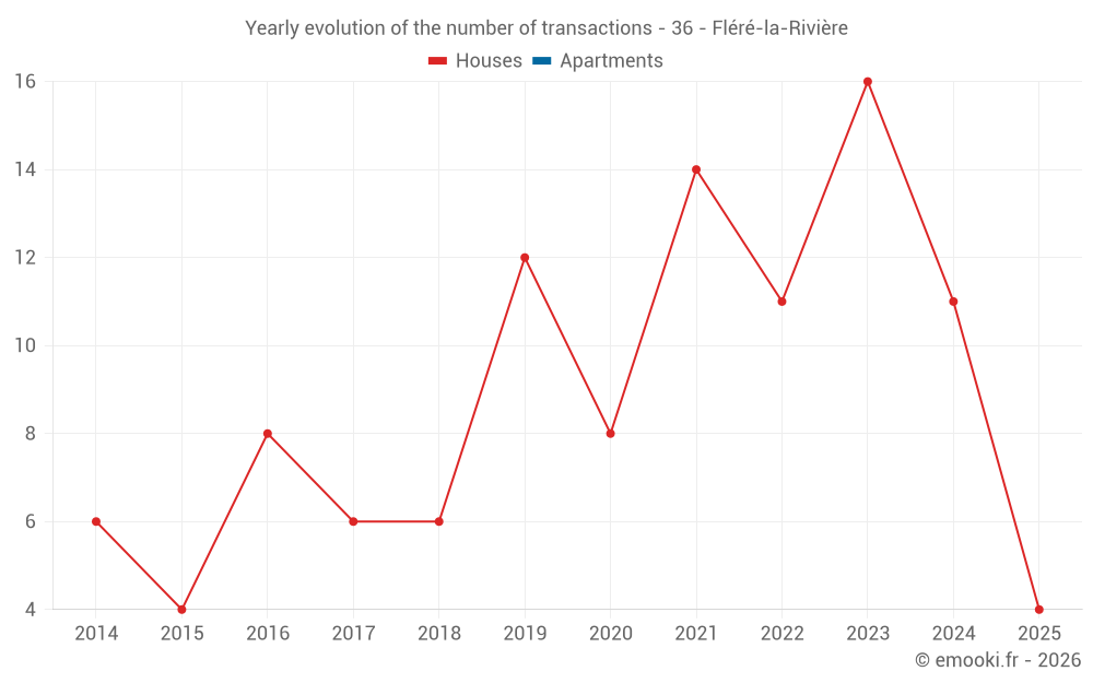 The median price on the 23 house transactions of the last 24 months in the municipality of Fléré-la-Rivière was 849 € per square meter for a median property value of 69 900 €. Over this period, 60% of transactions were between 646 and 1 365 € per square meter (from the 2nd to the 8th deciles).